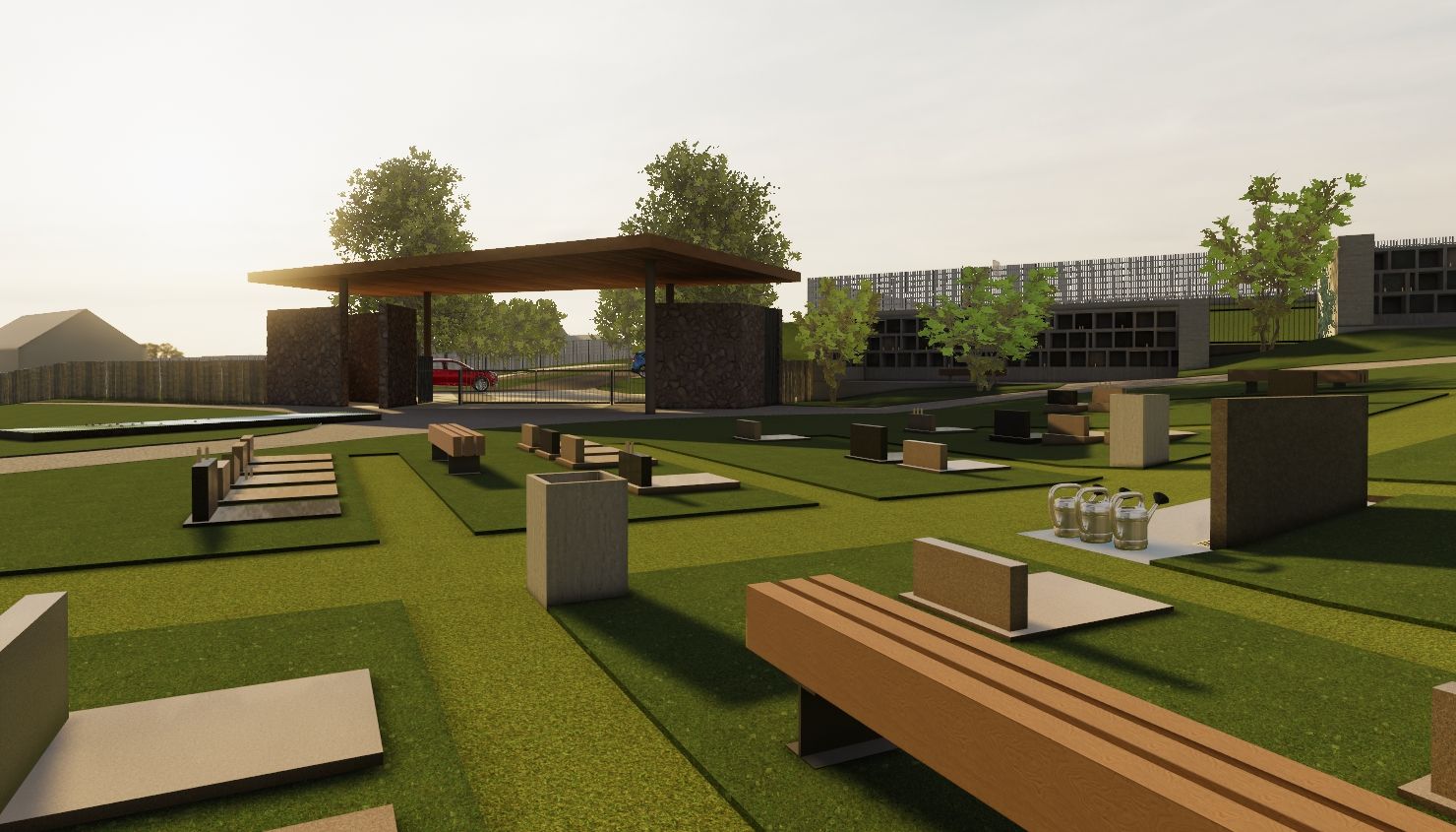 Nechybí zde dostatek zeleně, řada stezek, kterými je hřbitov protkán, lavičky k rozjímání a relaxaci nebo vodní kaskáda, kde lze zapálit svíčku a nechat ji plout. Součástí areálu je i rozptylová loučka nebo kolumbáriu s atmosférou inspirovanou meditativními zahradami a samozřejmostí je přístupová cesta s přilehlým parkovištěm.